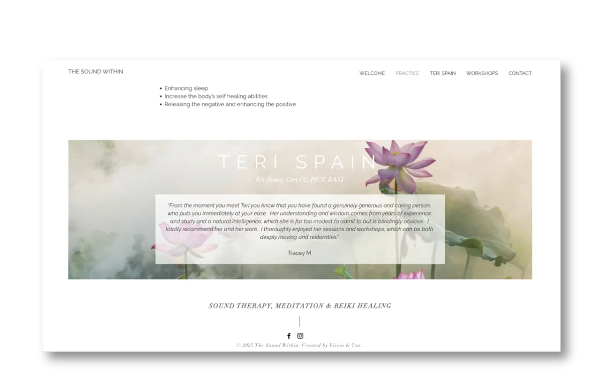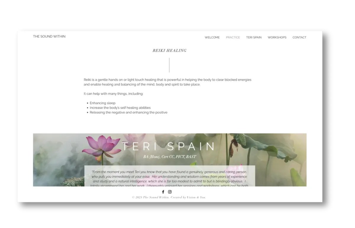 The Sound within, led by Teri Spain, offers deeply intuitive therapy with over two decades of experience in emotional and energetic healing. Through sound therapy, guided meditation and Ensofic Reiki, The Sound Within supports clients in finding stillness, clarity and inner balance. Sessions combine ancient practices with a grounded, compassionate presence, offering a space for deep restoration and with an approach that is gentle yet powerful, helping individuals reconnect with themselves and access their own healing potential.
